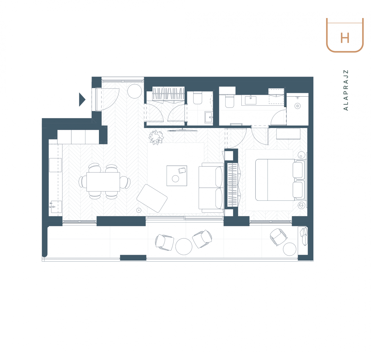 A „H” típusú lakások tágas, világos terekkel rendelkeznek, ahol a nyitott elrendezés és a teraszkapcsolatok kiemelt szerepet kapnak.